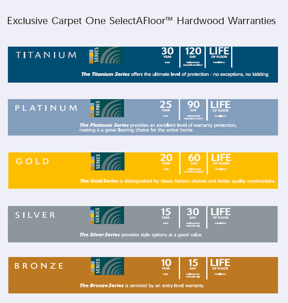 No Questions Asked Replacement WarrantySome of our exclusive hardwoods carry a No Questions Asked Replacement Warranty. If at any time after installation and during the term of your replacement warranty you wish to change your new hardwood for a different style or color wood floor your Carpet One retailer will replace it with different style or color of equal value from our SelectAFloor Hardwood display. Should you wish to replace your flooring with a SelectAFloor Hardwood upgrade, you may do so by paying the difference in price. No monetary compensation will be paid if a lower price product is selected.